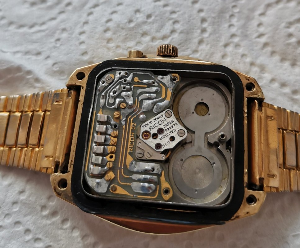 "1972 The 'Riquartz' caliber 550, first model with two batteries is introduced. The watch has a frequency of 32 kHz, a stepping motor, a tuning fork quartz and electronic parts made by Hughes Aircraft." [The Hughes anecdote is not verified. Ricoh did make LED watches with movements made in America by Hughes at around the same time.]