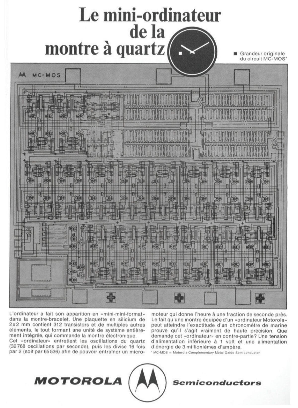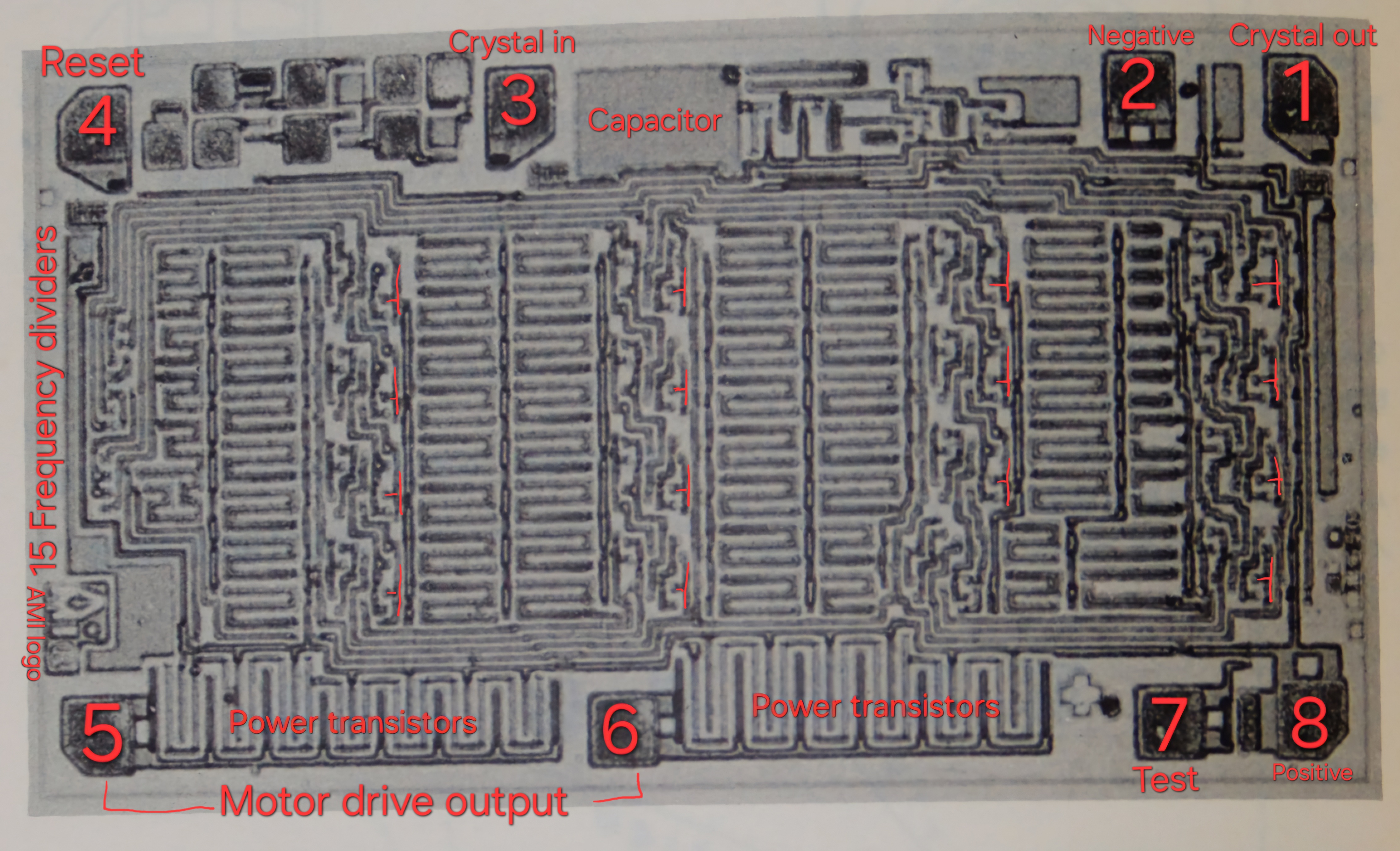Interesting this advert says 32,768Hz divided 16 times [instead of the usual 15] which give 0.5Hz [instead of the usual 1Hz], and the Girard Perregaux cal 352 manual also mentions 0.5Hz [though the motor pulses at 1Hz] and 312 transistors. So this image could be the IC used.