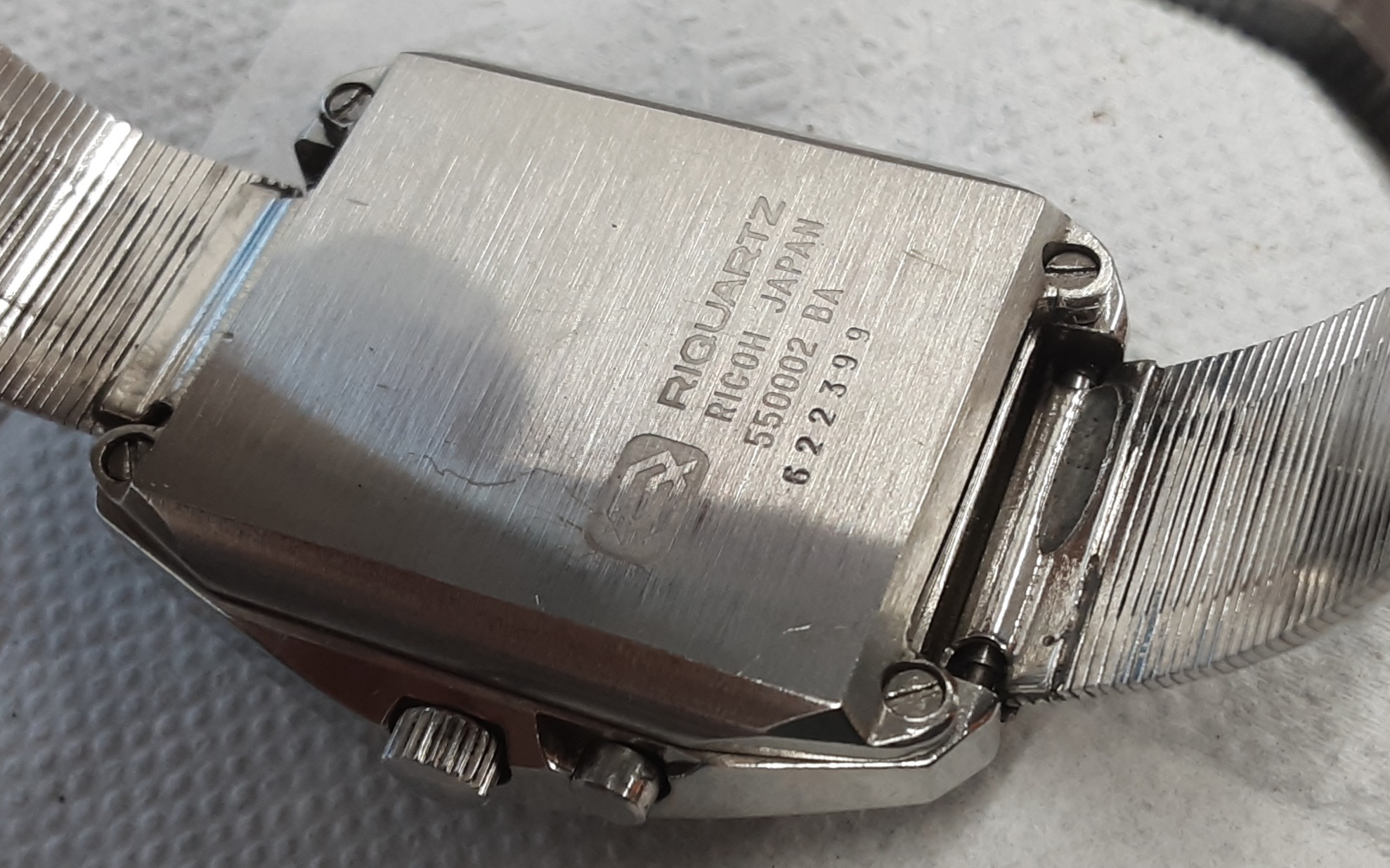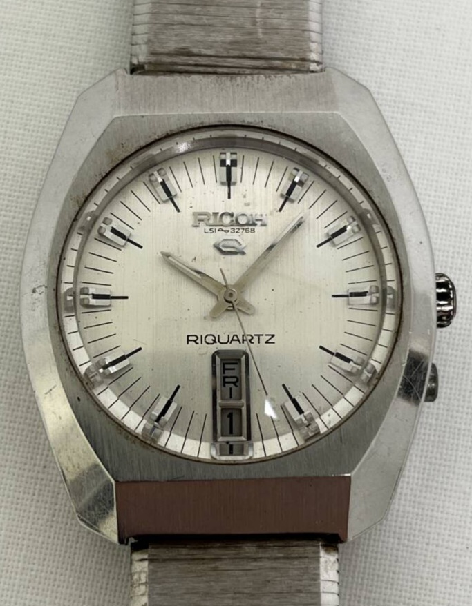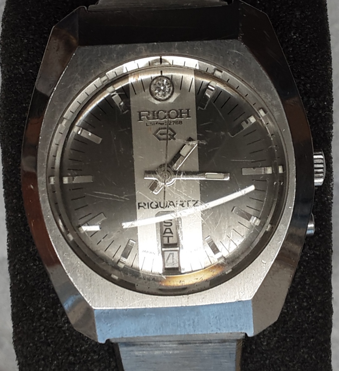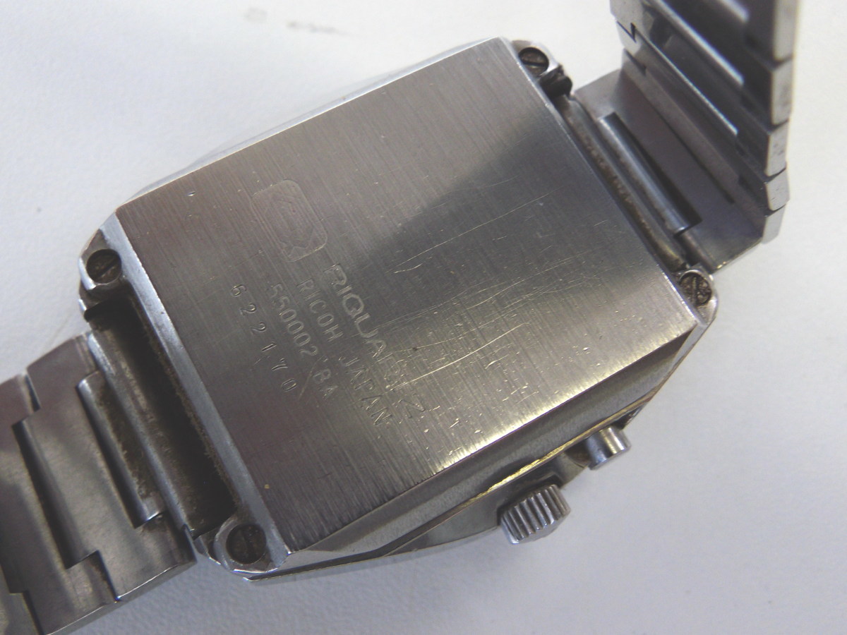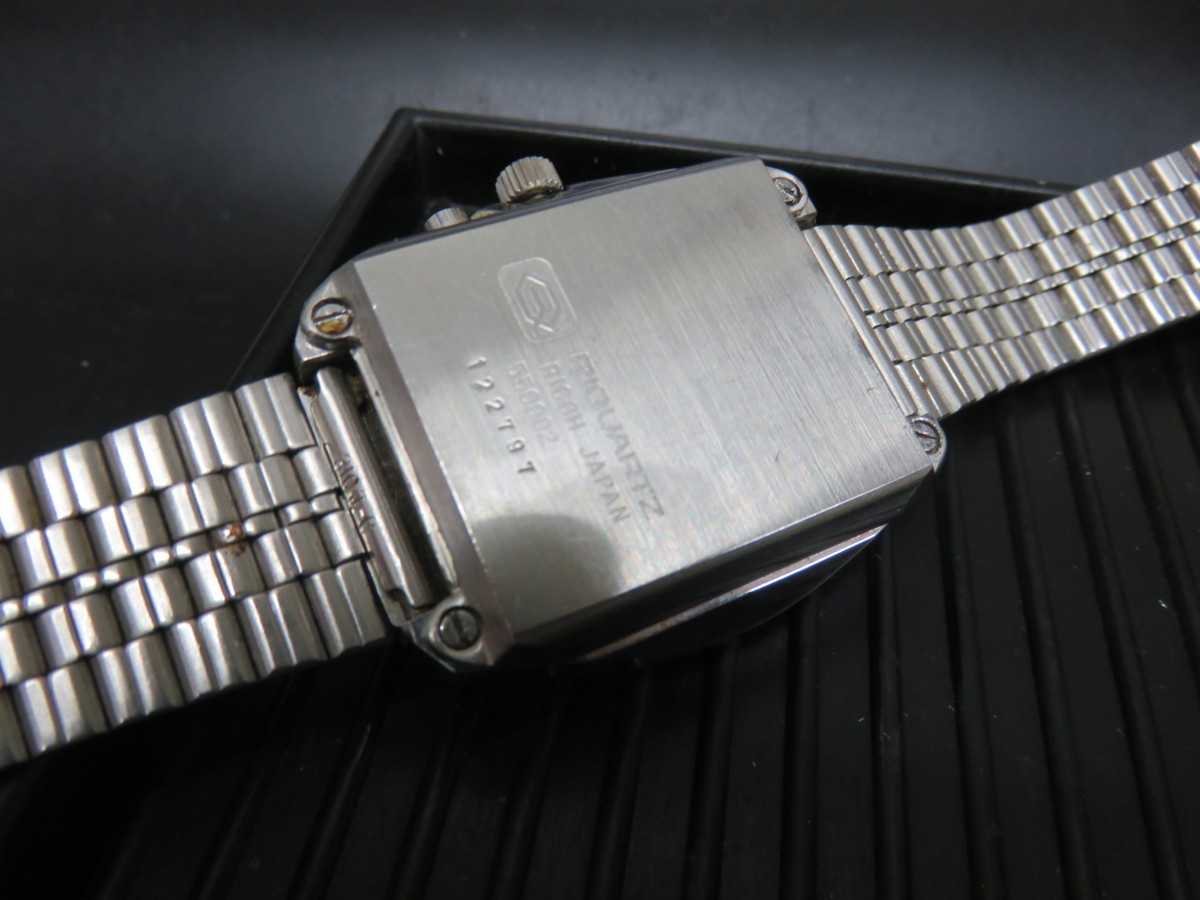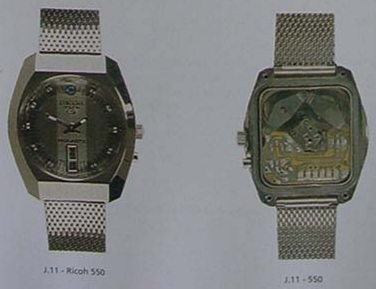 Introduced about 1972, using calibre 550. Available in stainless steel or gold plated. Advertised in Feb 1973 "Playboy" magazine as the “Ricoh quartz crystal wrist computer, guaranteed accurate to 5 seconds a month ... miniature miracle ... guaranteed for two years” for $295 (the mechanical watches carried a ten year guarantee)